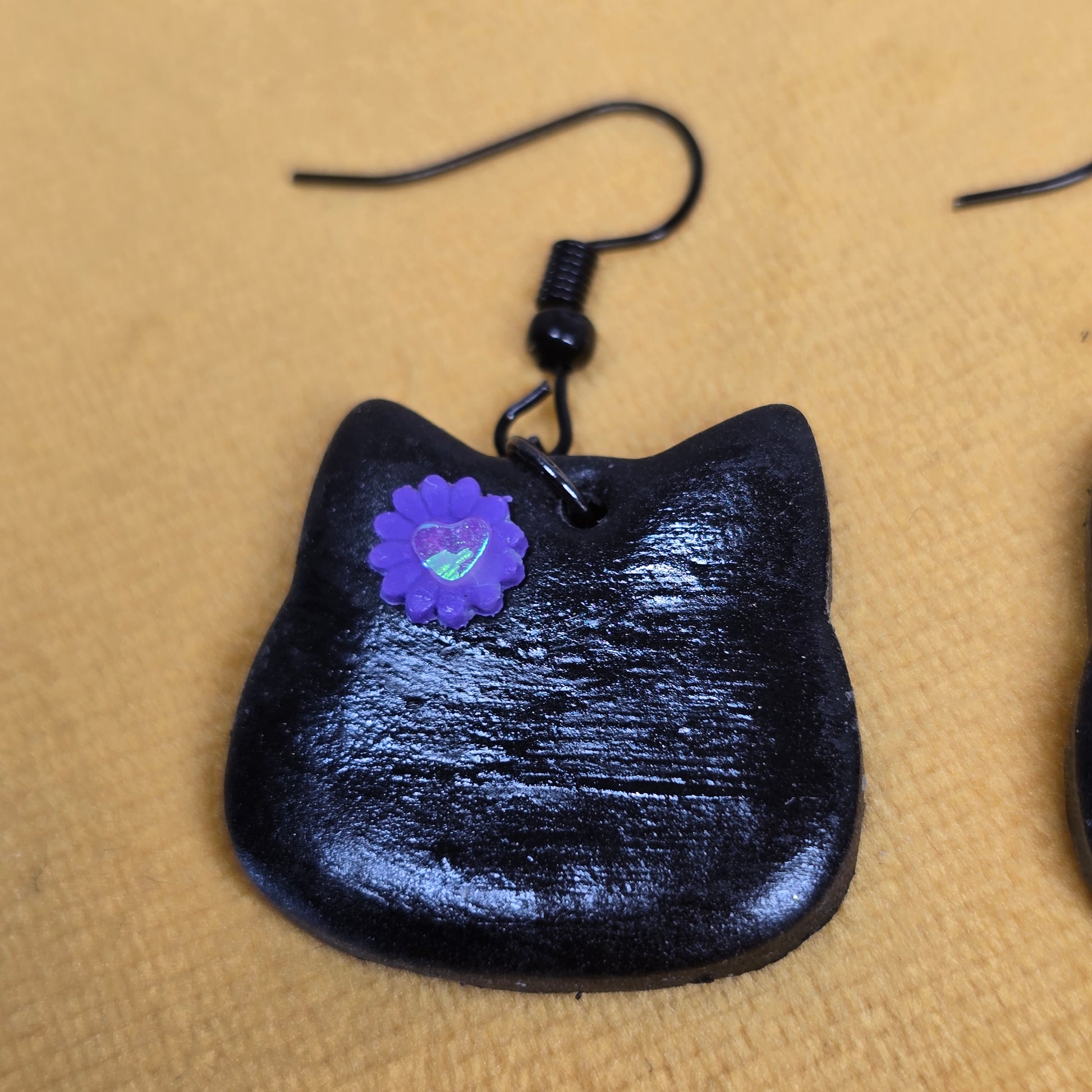 Unleash your inner cat lady with Kristyn Black Kitty Handmade Earrings. Handmade with polymer clay, these earrings feature charming flowers and glittery hearts. Perfect for Halloween and hypoallergenic for sensitive ears. Meow!