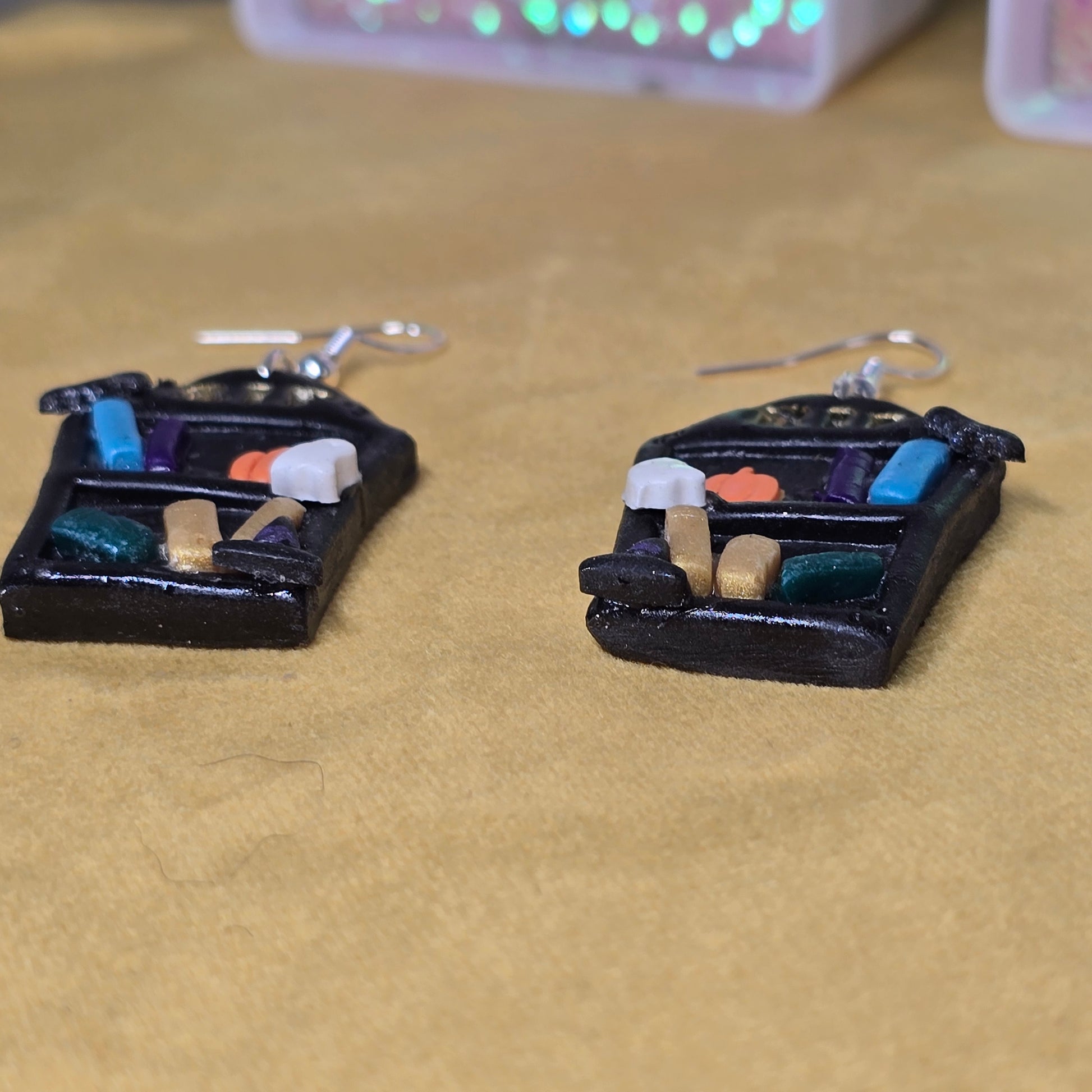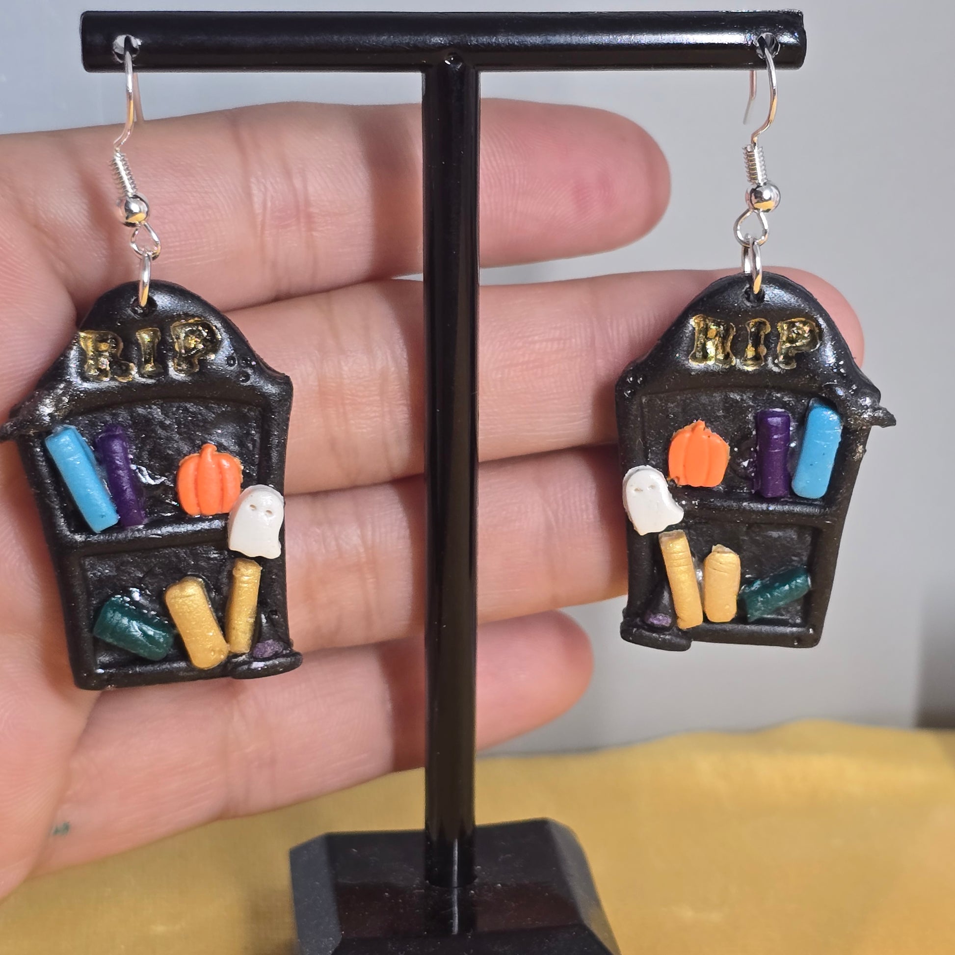 "Add a touch of spooky style to your ensemble with these R.I.P Book Shelf Handmade Earrings. Made from polymer clay, these earrings feature miniature books and creepy accessories. Hypoallergenic findings ensure a comfortable wear. Perfect for book lovers and Halloween enthusiasts alike. Rest in fashion with these unique earrings. (No ghosts were harmed in the making of these earrings.)"