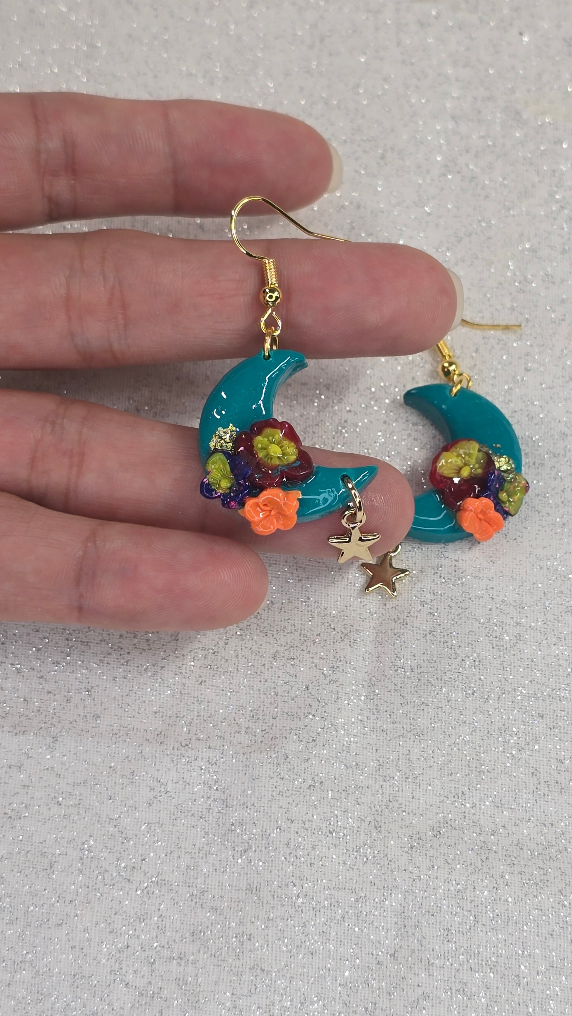 Add a touch of playful uniqueness to any outfit with our Tropical Moon Dangle Earrings. Handmade with love, these earrings feature a tropical moon design made of polymer clay and a resin finish. Each flower is also meticulously handmade. A must-have for any fun and quirky fashion lover!